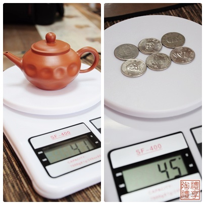 當我們拿出電子秤要來估量茶壺的重量時,這41克的答案讓我們驚訝不已,竟然比6個十元硬幣還要輕。這就是薄胎茶壺一大特色,輕。