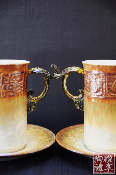 不同於以往的杯子造型,較為高瘦的杯款,是這對杯子相當吸引人的地方,李存仁老師在杯身上,運用陰刻以及陽刻的方式呈現出紋飾,而紋飾則是取材自明代的玉飾以及商周的青銅器圖騰。