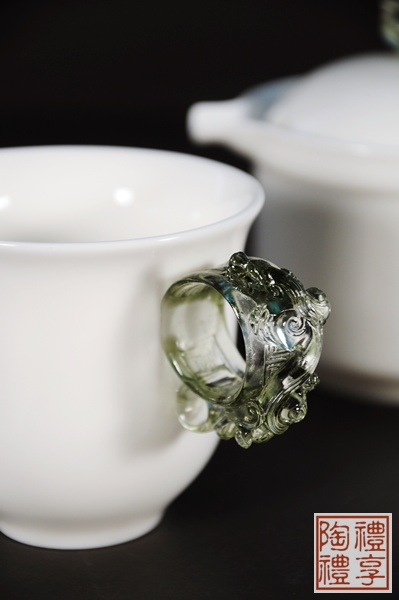 李存仁老師所推出的最新壺組─帝寶壺組,薄可透光的骨瓷,搭配上別具造型的琉璃,將茶襯托的完美無瑕。龍的第九個兒子─豼貅,專門吃金銀珠寶,而只進不出的特性,也擔任守候皇室財寶的角色,所以豼貅又名「帝寶」。李存仁老師將象徵招財的豼貅,運用在壺組上,其中包含了無限的祝福。